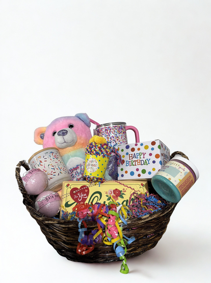 Celebrate someone special with our Serenity Birthday Surprise Gift Basket. This colorful and cheerful gift basket is filled with fun birthday-themed treats and cozy surprises designed to make anyone smile.