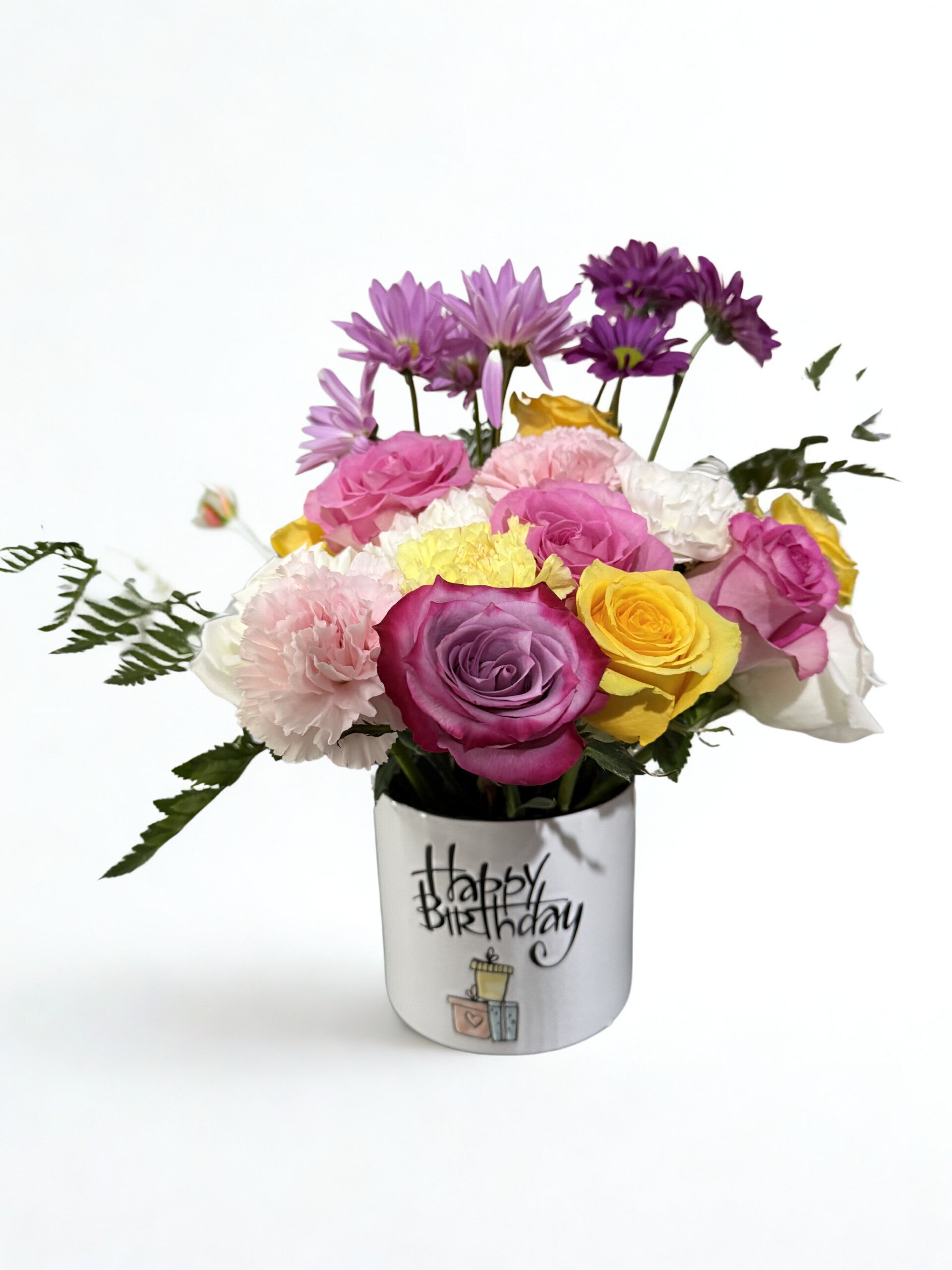 Presented in a decorative birthday-themed ceramic planter, this piece doubles as a keepsake gift that can be enjoyed long after the flowers have bloomed.