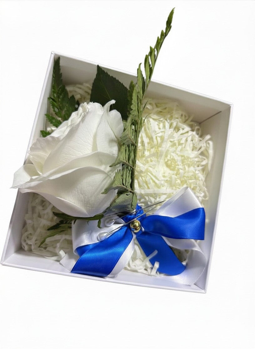 Add the perfect finishing touch to your special night with our elegant handcrafted white rose prom boutonniere. Designed with a fresh white rose, premium greenery, and a satin ribbon accent, this timeless piece is carefully arranged for prom, formal events, graduations, weddings, and special celebrations.